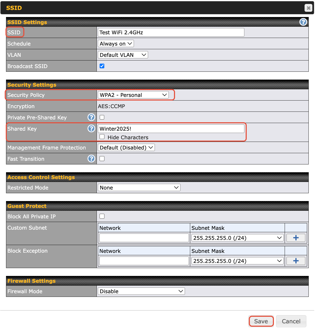 • Security Policy: WPA2 - Personal recommended, others can cause issues with security connections.