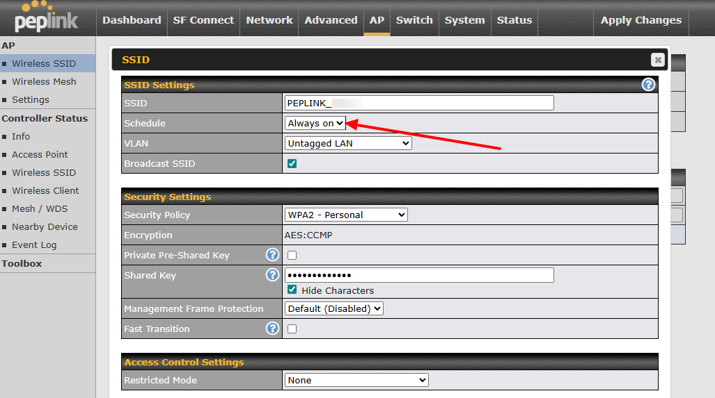 Make sure to click "Save" at the bottom of the page and click "Apply changes" top right afterwards. That's it! Your SSID is now set to run on the schedule you created!