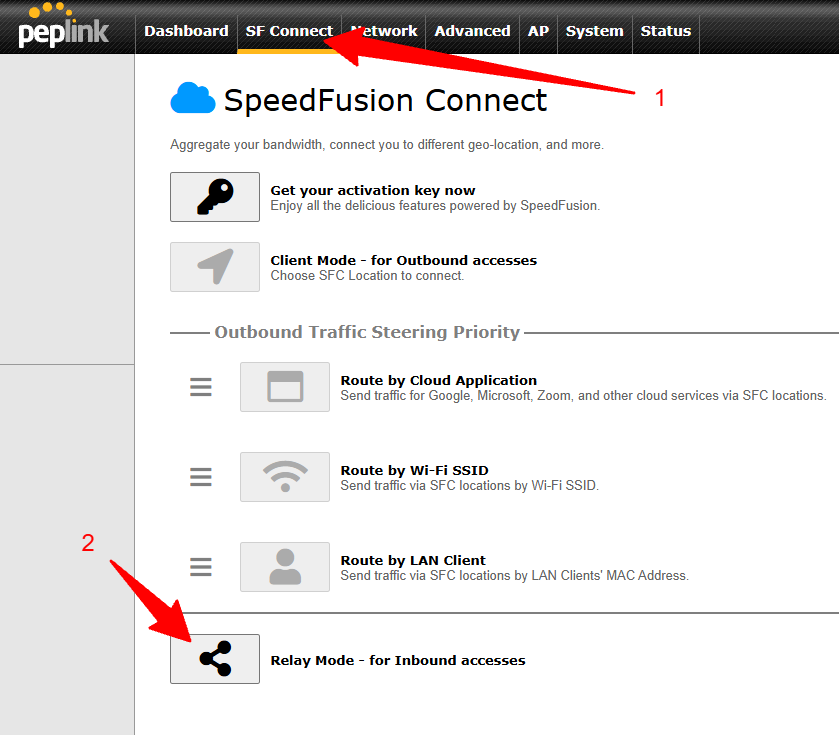Access the admin panel of your relay Peplink. If you do not know how, please follow this guide: Accessing Peplink Admin Page