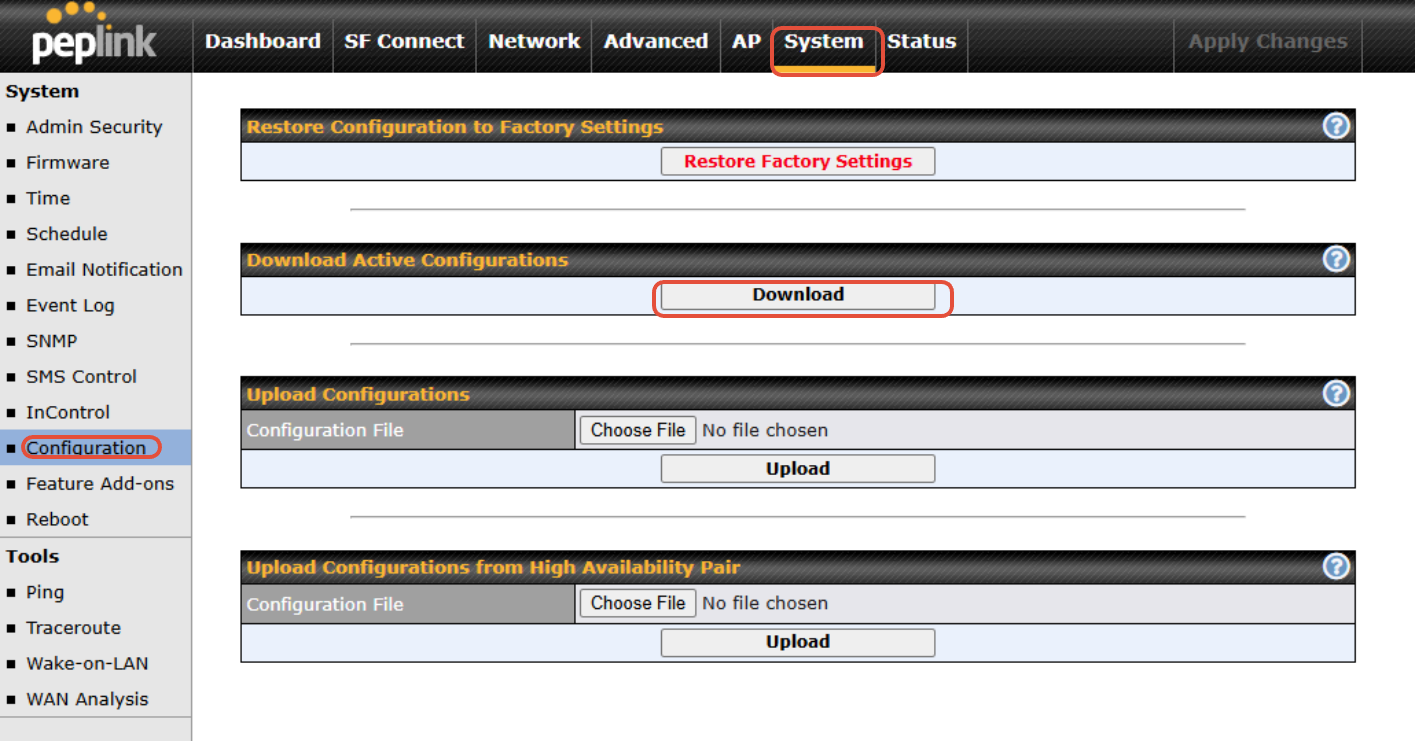 Once you've chosen which device will be your synergy controller, you will need to perform a factory reset of your secondary synergized devices. Before you do this, you should save the secondary device's current configuration, in case you ever need to restore it later. To do this, navigate to your "System" tab, and then click "Configuration" from the left sidebar. From there, under "Download Active Configuration," click the "Download" button to save your configuration.